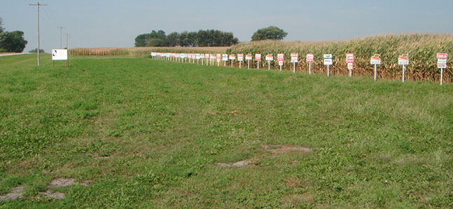 Example of a research plot with different varieties of seed planted in the same field to see how they perform in similar circumstances.
