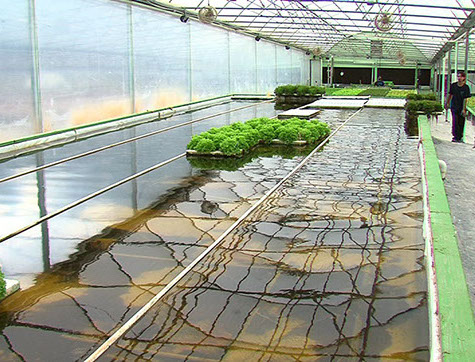 Example of long water-filled tanks in an aquaponics greenhouse