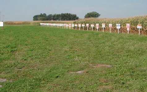 Example of a research plot with different varieties of seed planted in the same field to see how they perform in similar circumstances.