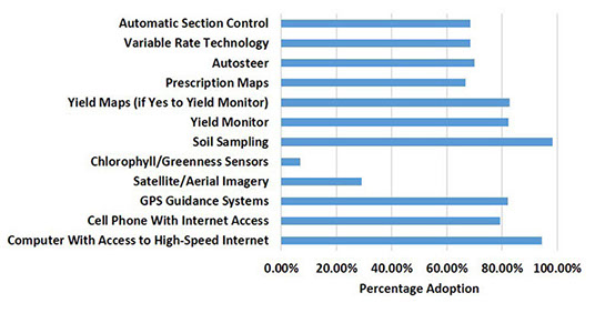 Summary of the adoption rates of numerous precision agriculture and ag data management tools currently available.